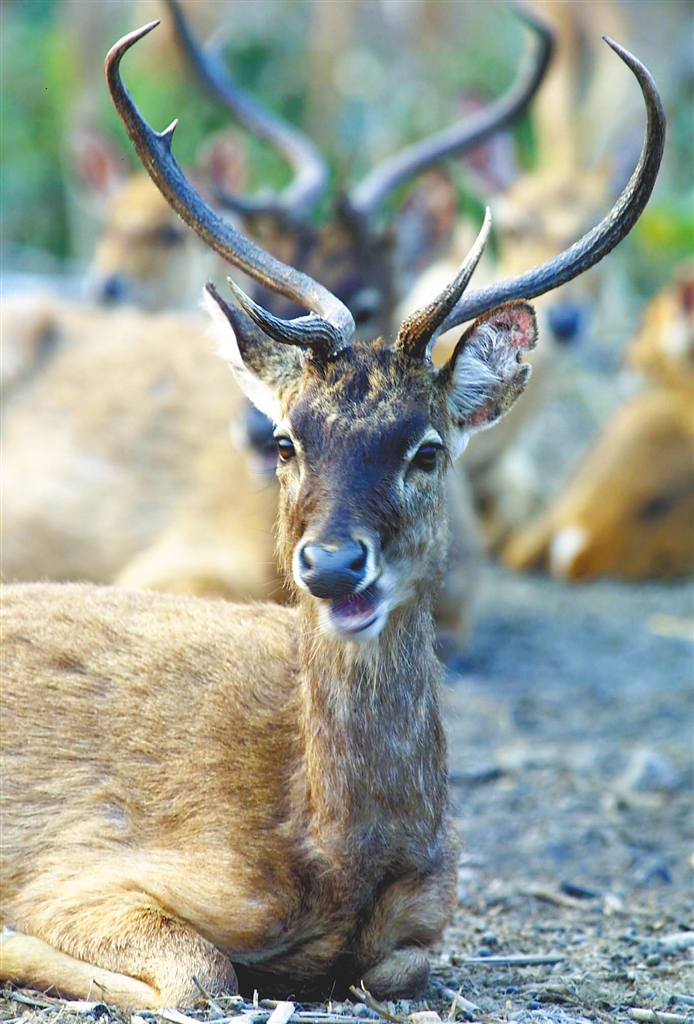 绿茸茸的草地上,一头雄性小坡鹿刚刚冒出尚显局促的鹿角,等到它两岁时,鹿角会慢慢长成。海南坡鹿最具特点的就是雄性头上优雅、壮观的双角,这是它们“风度翩翩”的体现,也是吸引雌鹿最好的“装饰品”。