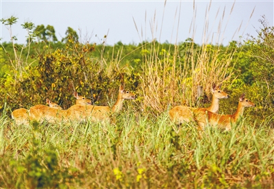 雨季到来时,这片天工织就的绿毯百草丰茂,循着原野鹿踪,便可看到这群成群结队的“琼岛精灵”在稀树草原上驰骋雀跃。在20世纪60年代之前人们的回忆中,野生的海南坡鹿曾经多如黄牛。如果没有猎杀,没有伤害,这应该会一直是海岛坡鹿的光景。