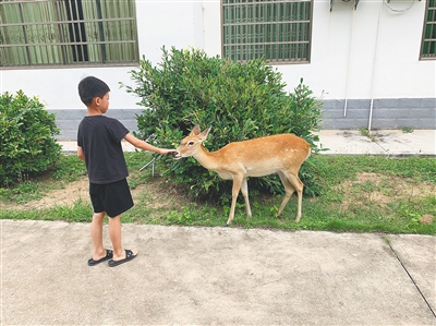 “田田”不是人类,而是一只背脊两侧缀满斑点的海南坡鹿。两年前,保护区里一只母鹿难产去世后,鹿崽便被汤表义抱了回来,取名“田田”并照料至今。