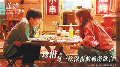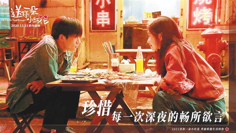 《送你一朵小红花》并不是一个纯粹的爱情童话,也带着烟火气息与本土色彩。通过男女主人公的视角,我们看到了在医院痛失爱女的农民工父亲,在大街上等候孙子归来的奶奶,为了家人辛苦打拼的聋哑外卖小哥。他们不需要别人的怜悯和同情,只是靠着自己的力量努力地活着,向每一位观众传递着亲情的可贵,传递着前行的力量。