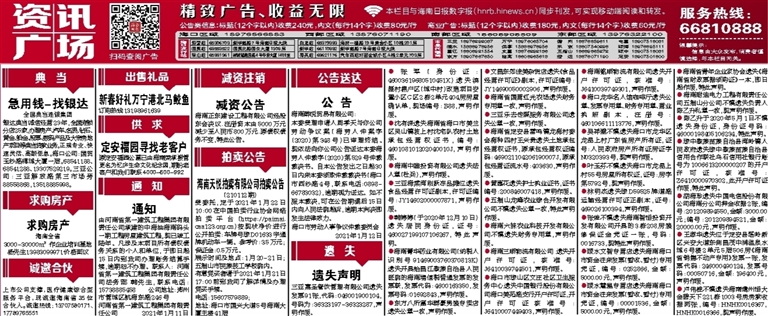 受委托,定于2021年1月22日10:00在中国拍卖行业协会网络拍卖平台(https://paimai.caa123.org.cn)按现状净价进行公开拍卖:车牌号琼D01633宇通牌机动车一辆。参考价:3.5万元;保证金:0.5万元。展示时间及地点:1月20-21日;五指山市民族技工学校院内。有意竞买者请于2021年1月21日17:00前到我司了解详情及办理竞买手续。电话:15607579889;地址:海口市国兴大道5号海南大厦主楼41层