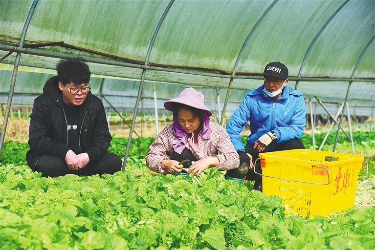 1月12日,趁着天气晴好,海口市美兰区金堆村村民周章蓉(中)来到常年蔬菜基地,在农技人员的指导下抢收青菜。