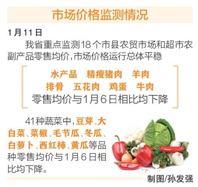 根据海南农产品流通公共信息服务平台监测数据,1月11日,我省重点监测18个市县农贸市场和超市农副产品零售均价,市场价格运行总体平稳。重点监测的重要生活必需品中,水产品、精瘦猪肉、羊肉、排骨、五花肉、鸡蛋、牛肉零售均价与1月6日相比均下降;重点监测的41种蔬菜中,豆芽、大白菜、菜椒、毛节瓜、冬瓜、白萝卜、西红柿、黄瓜等品种零售均价与1月6日相比均下降。