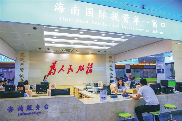 图①2020年5月29日,在海南省政务服务中心,海南国际投资单一窗口,工作人员正在接待投资者。
