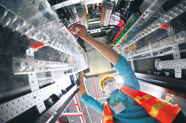 ③2020年3月4日,海南社会管理信息化平台指挥中心项目现场,施工技术人员正在开展设备的日常巡检工作。本报记者 王凯 摄
