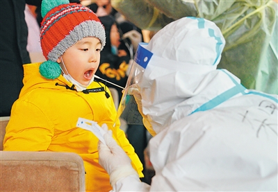 图为一名小朋友在河北省石家庄市桥西区恒大城社区内接受核酸采样。