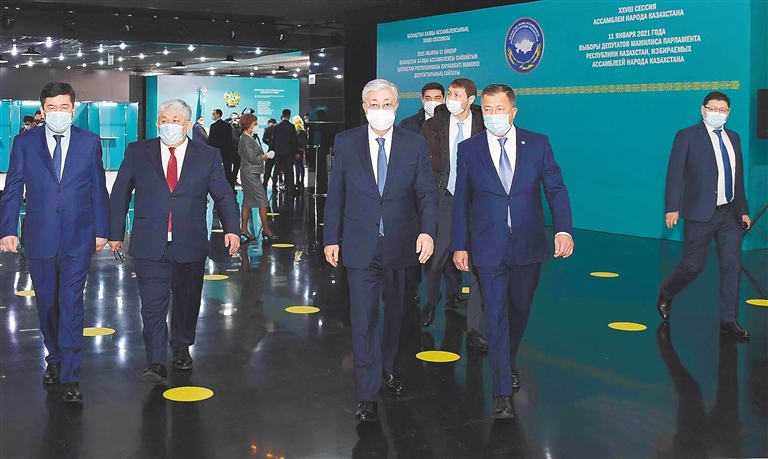 1月11日,在哈萨克斯坦努尔苏丹,哈萨克斯坦总统托卡耶夫(中)参加人民大会推举议会下院独立议席投票。