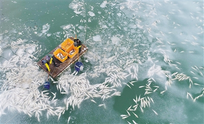 1月11日,在韩国务安,养鱼场的工作人员打捞在极寒天气中死亡的鱼。