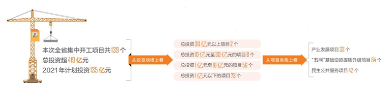 此次集中动工的项目,从类型上看,涵盖了产业发展、“五网”基础设施提质升级、民生公共服务等领域。其中:产业发展项目33个,投资共160亿元,约占全部项目投资的38%;“五网”基础设施提质升级项目64个,投资共167亿元,约占全部项目投资的40%;民生公共服务项目42个,投资共92亿元,约占全部项目投资的22%。