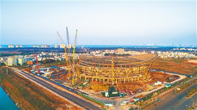 1月13日,俯瞰海口五源河体育馆项目。目前,该项目钢屋盖吊装已完成95%,计划本月底吊装完成,室内装修、训练馆及外裙房结构施工正同步进行。