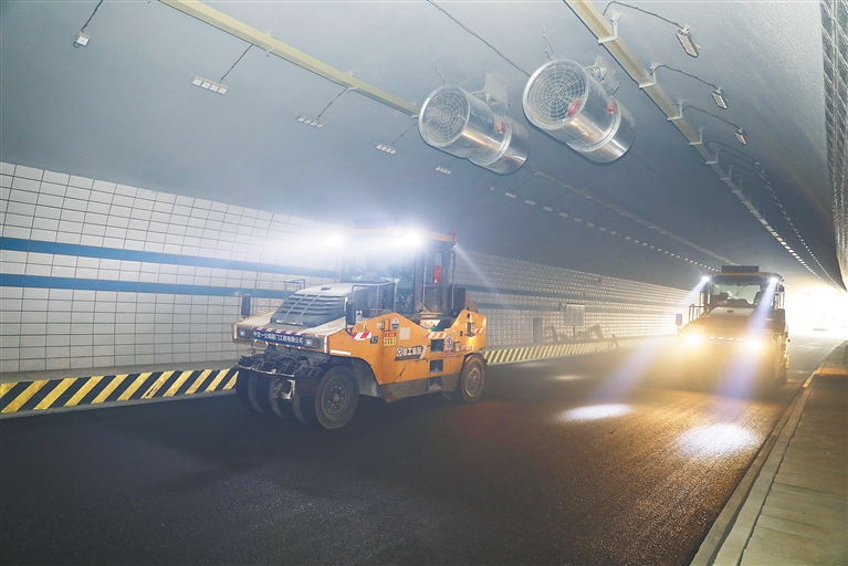 1月13日,在山海高速畅好隧道内,压路机来回压实沥青路面。