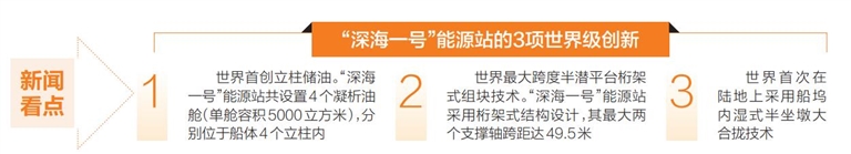 海南日报记者了解到,“深海一号”能源站由上部组块和船体两部分组成,按照“30年不回坞检修”的高质量设计标准建造,设计疲劳寿命达150年,可抵御百年一遇的超强台风。能源站还搭载了近200套关键油气处理设备,同时在全球首创半潜平台立柱储油,最大储油量近2万立方米,实现了凝析油生产、存储和外输一体化功能,具有较好的经济效益和技术优势。
