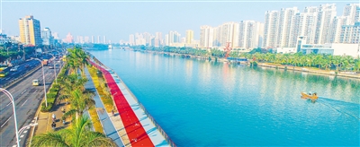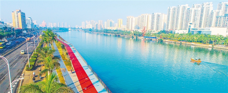 据了解,海口湾畅通工程岸线全长约19.6公里,在海口湾至海甸溪南北两岸,建设滨海滨江漫步道、跑步道、骑行道。目前,该工程三期正加紧建设,全部建成后将真正实现还海、还岸、还景于民,整体提升海口的亲水景观环境。