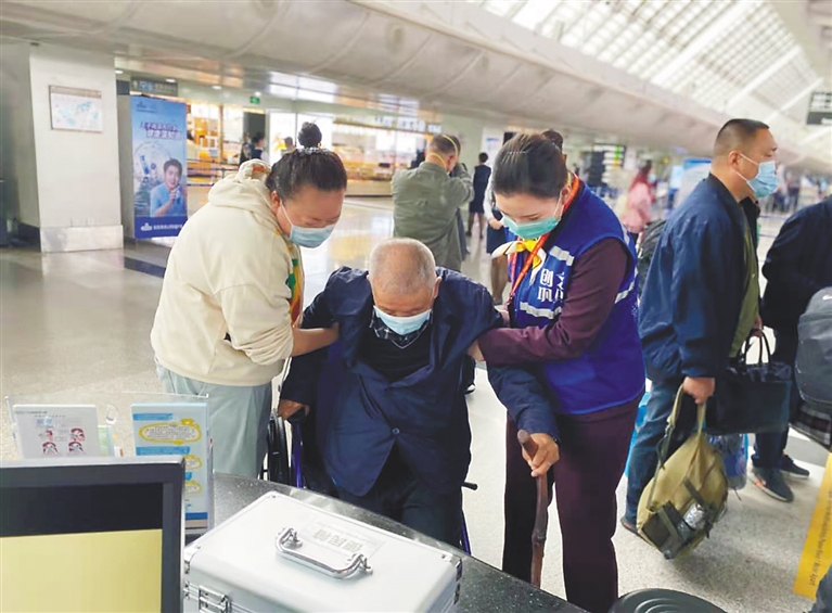日前,在三亚凤凰国际机场,机场工作人员正在搀扶行动不便的老年旅客。三亚凤凰国际机场近期在安检、扫码、行李寄存、饮食等方面推出系列出行服务,为广大旅客提供出行便利。