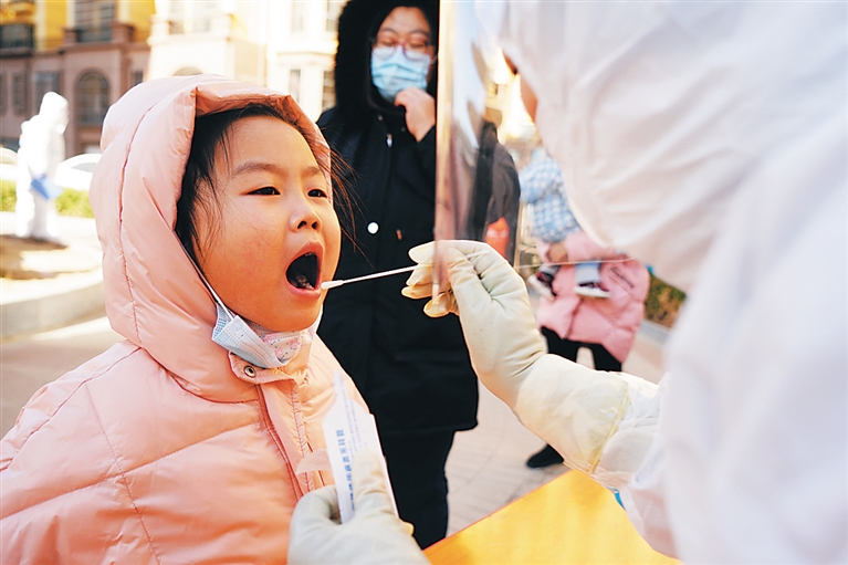 1月17日,河北省邢台市抽调1690名医务人员奔赴南宫,协助进行第三轮全员核酸采样、检测工作。图为医务人员在河北省邢台南宫市翰墨儒林小区核酸检测采样点采样。 新华社发