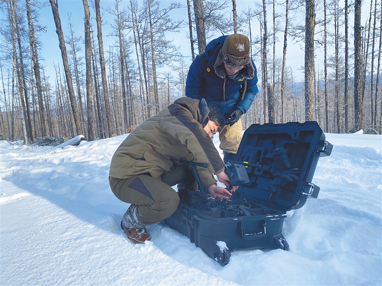 图为科研人员在内蒙古大兴安岭汗马国家级自然保护区调试无人机远红外热成像系统。