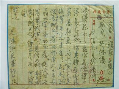 “我于九月间接到一函,阅信之后重重泪,悉知其生得男儿,家中大小各得平安,方才安慰……今托琼熟代带回牛奶四瓶、饼干一罐、金油二瓶、鹧鸪茶二包、铁头刀一把、牛奶粉一瓶……望母亲自己调理好身体,安置孩子去学校读书。”