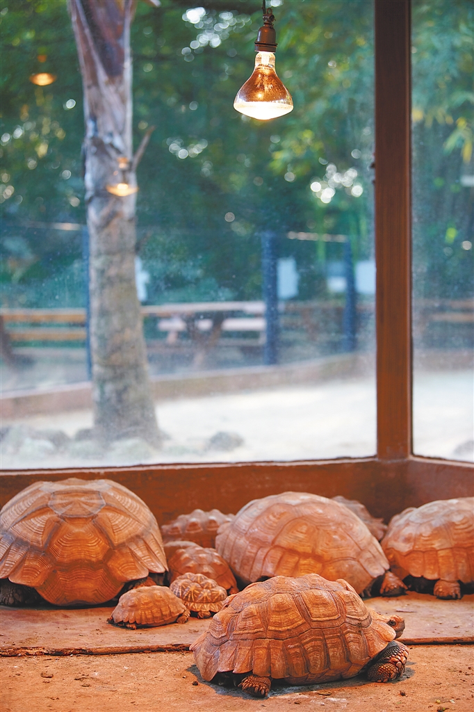 来自非洲的苏卡达陆龟也对温度较为敏感。前些天的冷空气就把海野动植物园里的一只苏卡达陆龟冻感冒了。“发现它流鼻涕后,我们用30℃的水给它泡了澡,加快它的新陈代谢,出太阳时又把它抱出去晒太阳。”吕亚奎说,苏卡达陆龟是纯素食性的动物,主要以青草、仙人掌、莴苣等高纤维的植物为食,为了让苏卡达陆龟更舒适地生活,海野动植物园遵循“更接近自然、更加生态”的原则,使用草坪、细沙、热带植物等元素布置展馆,模拟其原生的自然环境,展区中还建有一个大水池供苏卡达陆龟嬉戏。