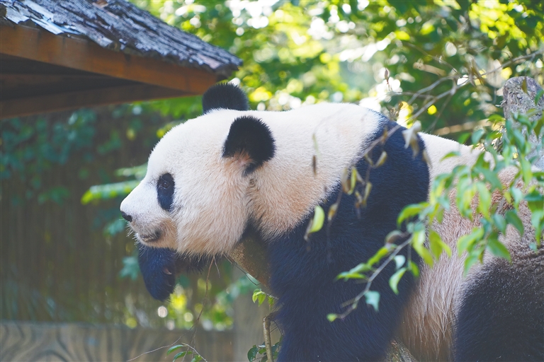 记者到访时,曾在第七届“全球大熊猫奖”中获得“中国最惹人喜爱的大熊猫”奖项金奖的大熊猫贡贡刚刚吃完“下午茶”,正坐在室外的水池里自在地玩球,一颗球被它放在掌中转来转去,后肢还不自觉地跟着一起摇晃起来,似乎心情极佳,而在它的隔壁展馆,它的弟弟舜舜也在树上玩得不亦乐乎。