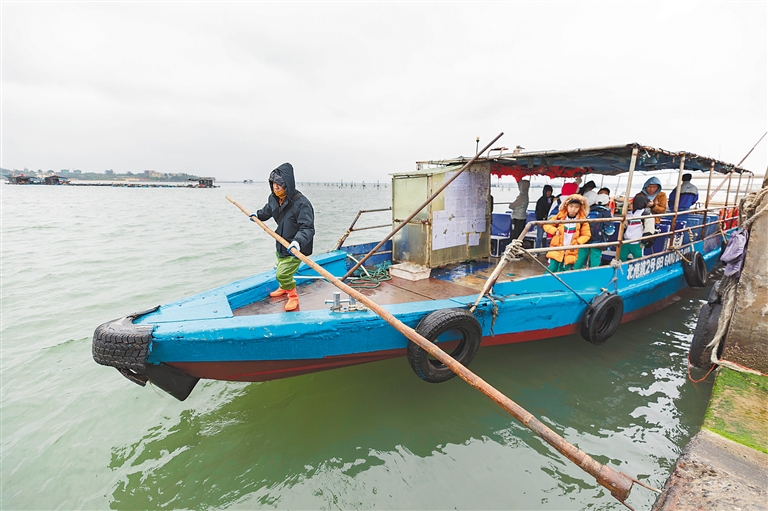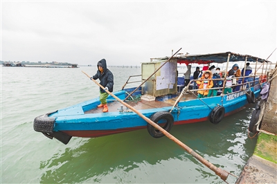 拐下海文大桥下方的施工便桥,站在北港岛北边的环岛公路上,眼前是一片碧蓝的大海。阳光里,大大小小的渔船散落在海面,岁月静好。继续前行约一公里,到了北港岛数百年出行的渡口。渡船停靠,村民提着从对岸铺前集市买来的生活用品分散着朝家的方向前行,不紧不慢。