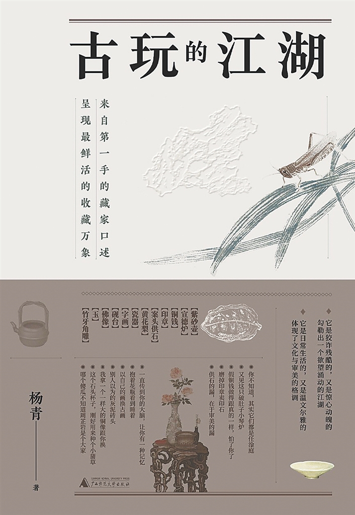 《古玩的江湖》,记载的便是资深藏家小茆从铲地皮起家,在古玩界行走数十年的人生历程。当然,在尔虞我诈的江湖路上,小茆一路走来,也是磕磕绊绊,几度惊险。他深谙内里门道,练就了一双火眼金睛。当随着书中的脉络走入古玩世界,十二个古玩大类尽显眼前,其中包含大量的字画、瓷器、印章等,它们有着精致的外观、曲折的历史,或许流落在外,被别人当作无关紧要的器皿随意处置,留下了难以愈合的“伤疤”;或许辗转多人,成为他人眼中的赚钱工具,却没有得到精心的呵护。因此,当我们在书中细数古董的过去时,总能从它们身上的每一道纹路中听得那无言的叹息与呻吟。这种心境倒是与小茆的经历颇为契合——一开始,小茆接触古玩全然是为生计所迫,时日久了,他对古玩的情感反而纯粹起来。在“欢喜得不得了”中,他用浅显的语言揭露了圈子中的制假工艺和流通故事,就连平平无奇的铜钱也蕴含着不少门道——为使上面的锈迹更加自然,需要“拿酸一点点往上点”,然后“用盐水或漂白粉,让它变黑,或变绿”,最后“学西安人,放在土里埋几天”,铜钱就成型了。同时,为了让假铜币看起来真实,几位同行甚至选用一种能做出糠哑声的铜片,令人无法分辨声音的真假。可见,在这场“江湖宴”中,真真是尔虞我诈,防不胜防,充满了欲望的争斗与较量。