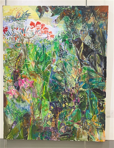 在“雨林故事”这批画作中,“泛滥”的绿色就像扑面而来的雨林湿热空气。如何避免重复地表现一种绿?袁华华在生活里观察入微,比如充足的光线照在树上,它的绿会千变万化,而早晨、中午,或是天气灰蒙蒙时的阳光所传达的绿又都是不一样的。对待同一件事,不同的心态就会有不同的看法,袁华华希望自己可以用积极向上的心态来理解事物。