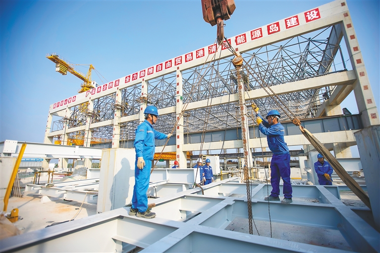 1月18日,工人在万宁市北大镇的大唐万宁燃气发电项目现场作业,该项目总投资约20亿元,力争在6月底建成投产运行。
