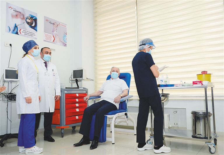 图为希莱里耶夫(右二)在阿首都巴库准备接种中国产新冠疫苗。