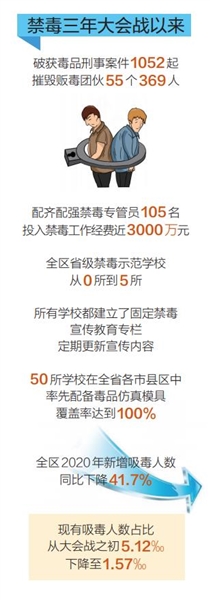 全区2020年新增吸毒人数同比下降41.7%,现有吸毒人数占比从大会战之初5.12‰下降至1.57‰,提前超额完成既定目标。