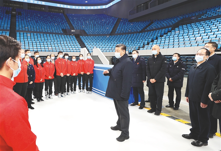 首都体育馆是国内第一座人工室内冰场,经过改扩建已具备冬奥会短道速滑和花样滑冰比赛训练条件。习近平走到训练场边,察看场馆改造情况,同国家花样滑冰队和短道速滑队运动员、教练员代表亲切交流。习近平指出,建设体育强国,是全面建设社会主义现代化国家的一个重要目标。体育强国的基础在于群众体育。要通过举办北京冬奥会、冬残奥会,推动我国冰雪运动跨越式发展,补缺项、强弱项,逐步解决竞技体育强、群众体育弱和“夏强冬弱”、“冰强雪弱”的问题,推动新时代体育事业高质量发展。提高现代竞技体育水平,既要靠气力,也要靠技力。运动员要有为国争光、勇创佳绩的志气,夏练三伏、冬练三九,加强技术创新,学习借鉴国外先进理念和技术,不断提高训练和比赛水平。
