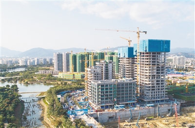 近日,位于三亚中央商务区的大悦城环球中心项目工地,塔吊林立,施工人员正在加紧施工。目前,该项目建设进展顺利。
