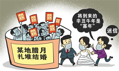 河北、黑龙江等地的疫情牵动人心。在流调结果中,“婚宴”成了高频词,各地纷纷倡议“婚事缓办”。但是,据新华社报道,由于即将到来的辛丑牛年在迷信说法中是“寡年”,还是有不少新人把婚期提前到腊月,形成扎堆结婚现象。