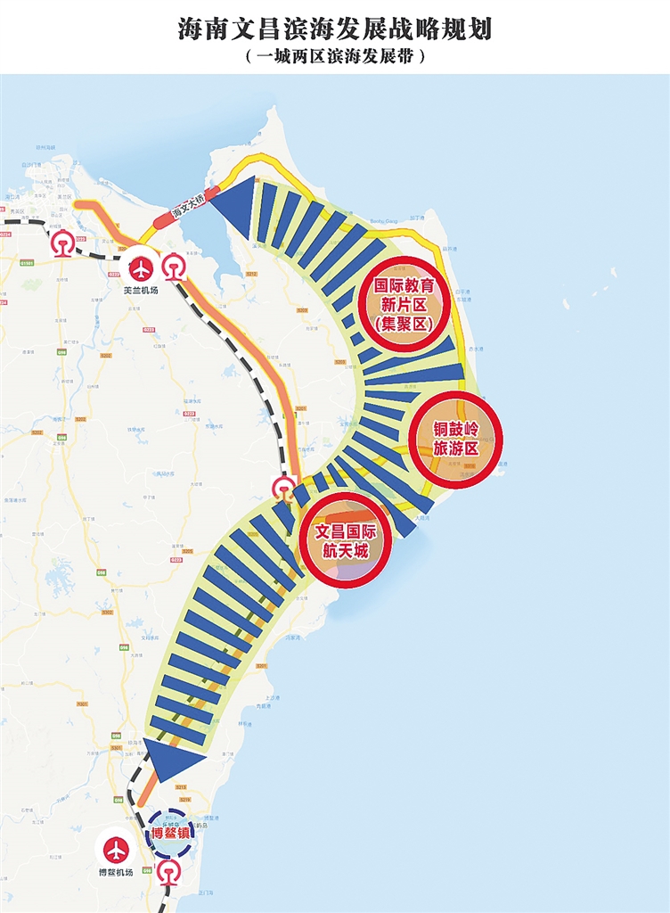 把握新时代发展机遇,文昌提出在“十四五”期间打造“琼北旅游消费目的地”的目标,其中“两桥一路”湾区将重点发展航天、科研、教育、康养等产业。