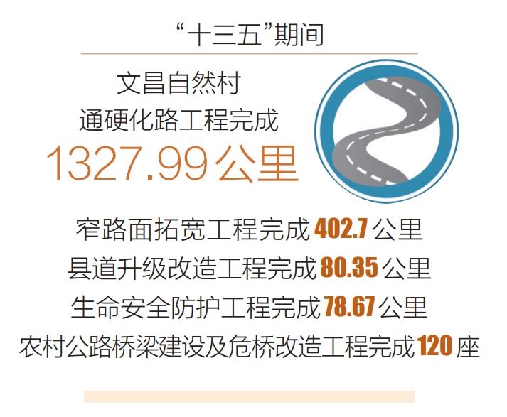 本报文城1月20日电 (记者李佳飞 实习生张珂月)1月20日,海南日报记者从文昌市交通运输局农村公路“六大工程”指挥部获悉,“十三五”期间,文昌市农村公路“六大工程”顺利收官,自然村通硬化路1300多公里,进一步优化了农村公路路网结构,提升了农村交通环境。