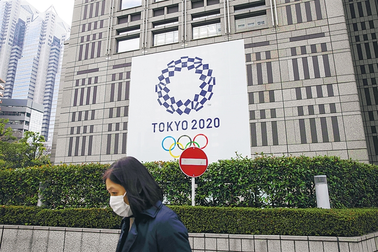 图为22日,一名戴口罩的行人从挂有东京奥运会标志海报的日本东京都厅大楼前走过。 新华社/法新