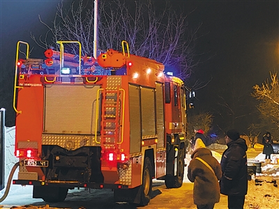 图为一辆消防车停靠在发生火灾的养老院附近。