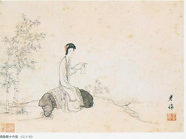 《隐居十六观》作于1651 年,是明代画家陈洪绶(号老莲)逝世前一年的作品,是16 帧表现隐居生活的白描人物画,现藏台北故宫博物院。16 幅各有用典,当中援引了庄子、刘辰翁、苏轼、陶渊明、班孟、宗炳、孙楚、魏野、李白、鱼玄机等人的事迹。其中固有借古人以点题,又似有老莲真实生活经历之写照。借画写意,以寄幽情。人物造型略有夸张,衣纹细劲流畅,富有装饰味。全画创意新颖,构图简洁,设色淡雅,近似白描。为陈洪绶人物故事画精品。