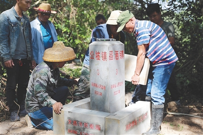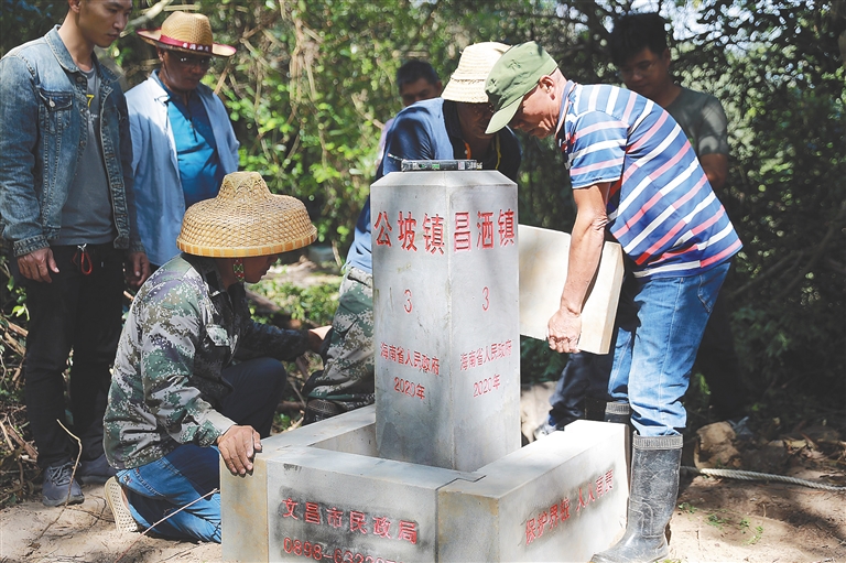 五年一次的乡镇级界线联检又开始了。2020年11月19日上午,符江华带着工人到文昌市翁田镇、昌洒镇和公坡镇三镇交界线上的3号界桩处进行换桩作业,原来那块三镇交界的三面界桩结束了16年工作使命。