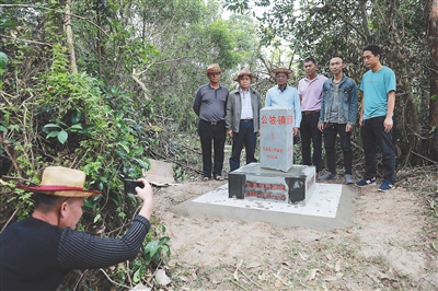“一、二、三加油!一、二、三加油!”富有节奏的“加油”声从杂草丛生的山坡上空传来,五个汗流浃背的搬运工扛着一块三百斤重的玄武岩石碑穿行在小径中。一位晒得黝黑的“向导”挥着镰刀砍倒野草给工人“开路”,他就是文昌市民政局界管员符江华。