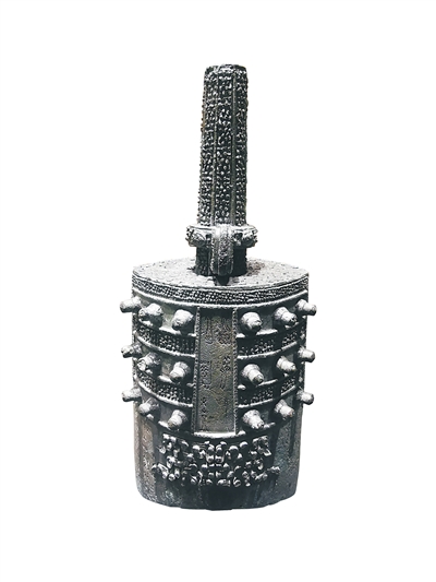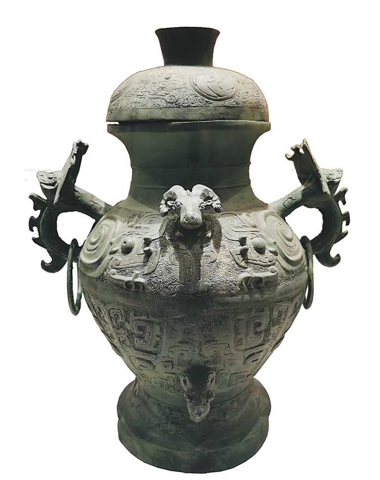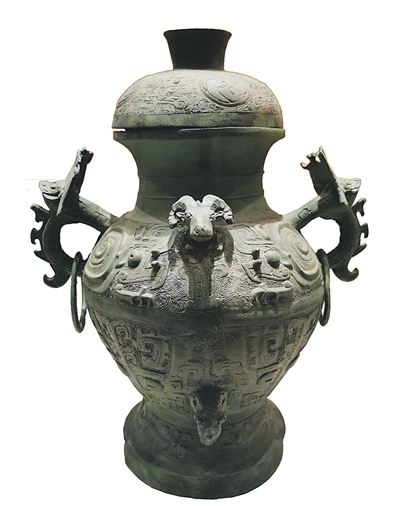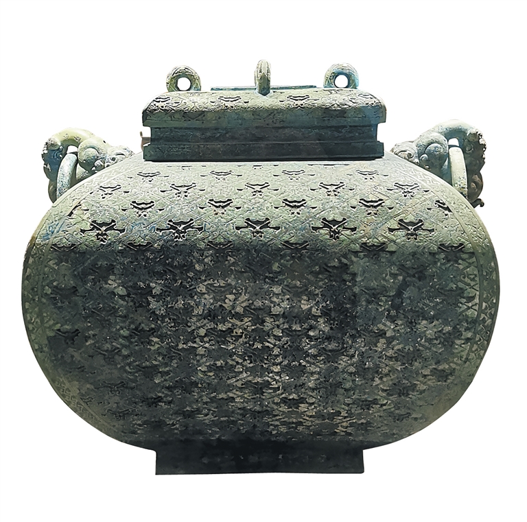 此外,曾国青铜器的器形和纹饰之美也是可圈可点。像西周早期的尤亼(ji)白(伯)方鼎,柱足瘦高挺拔,上腹饰以一首双身的龙纹配搭下腹部左右背身而立的小鸟,器型虽小,但整体对称性的布局却给人以规范稳重之感。另一件蜗龙纹铜罍上底部为云雷纹的地纹、地纹之上主纹饰以兽面纹和涡纹,主纹饰之上还有一些简单的纹饰,此外两夔龙耳的背上有扉棱装饰,颈腹相交和下腹部还有羊首等立体雕饰,这是商末周初青铜器上常见的“三层花”装饰,在对称规范之中又透出繁缛的气息。展览中春秋战国时期的几件青铜器,还将这种繁缛变为一种审美:比如三件春秋晚期的曾侯璵编钟,细密的蟠螭纹饰在钟的甬部、篆部和鼓部等地方都有分布,尤其是甬部密密麻麻地被纹饰所包裹;另一件战国菱形勾连云纹敦(dui),遍体的复杂纹饰有数层之多,在中国已发现的诸多青铜敦中,此件的精美程度绝对是首屈一指。