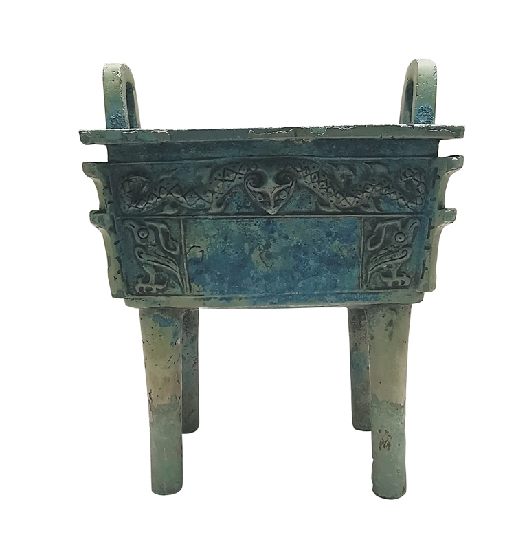 对于曾国青铜器的器形和铭文,观众或许难以辩识,但多会被其独有的锈色之美所征服。或因于青铜配比的原因和汉东之地独特的埋藏环境,不少曾国青铜器都呈现出遍体孔雀蓝的锈色,这种经历时间造就的美,甚至比青铜初铸时的金黄色更胜一筹。像此次展览的重器——战国中期嵌松石菱纹铜方缶,据湖北省文物局工作人员彦成钢介绍,打开缶盖后,内壁还存有带结晶的铜锈,若用亮光照射,会出现宝石般的点点光泽。不少曾国青铜器的蓝锈、绿锈与青铜的肌体相融,有些部位用肉眼观之,冰冷的铜器似化作温润的绿松石,这样的铜器质感是曾国青铜器独有的美。