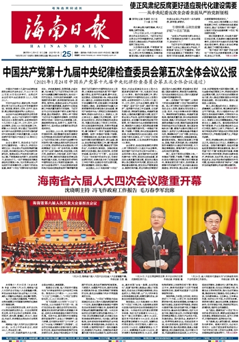 | 海南日报 头版 001 2021-01-251 2021年01月25日 星期一 |