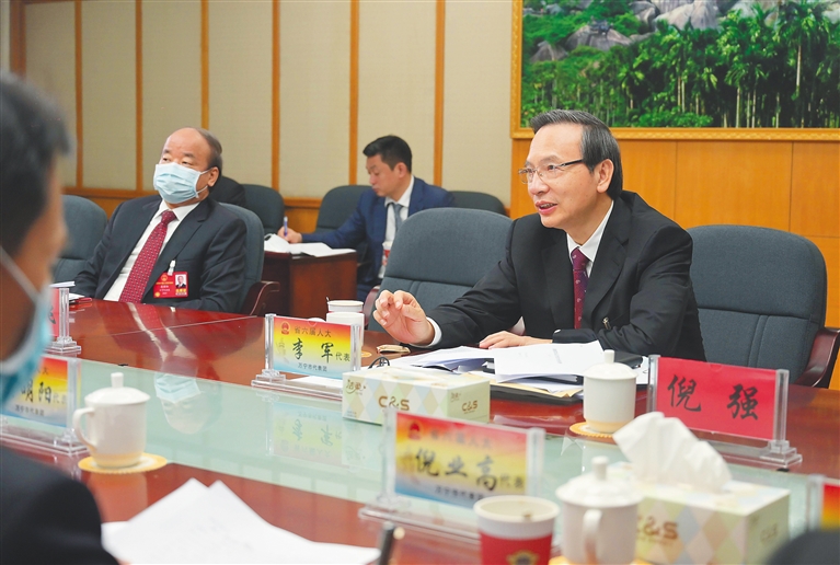1月24日,参加省六届人大四次会议的代表们分组审议政府工作报告。图为李军代表参加万宁代表团审议。本报记者 王凯 摄