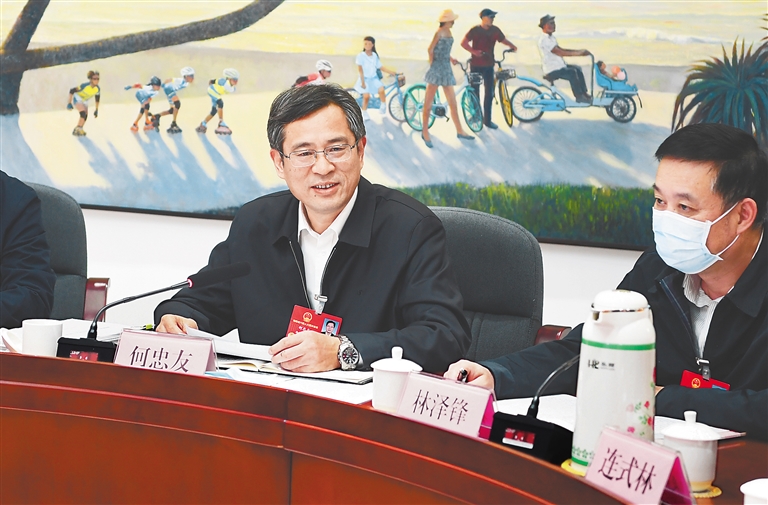 1月24日,参加省六届人大四次会议的代表们分组审议政府工作报告。图为何忠友代表参加海口代表团审议。本报记者 王凯 摄