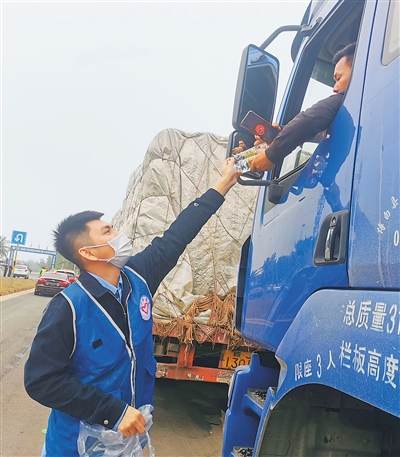 1月25日下午6时许,新海港车辆进港的队伍排到了粤海大道。“您好,需要矿泉水吗?”62岁的志愿者赵同伟正在路边给司机发放矿泉水,并协助交警引导交通。