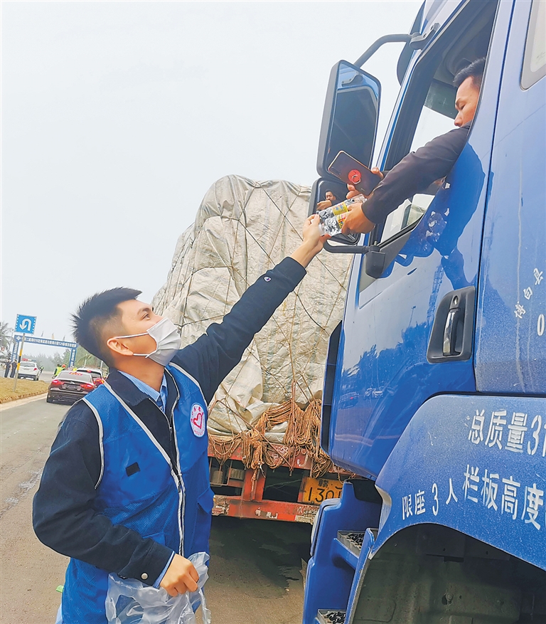 在海口各港区及沿线路段,还有600多名像赵同伟一样的志愿者和应急保障人员,他们或穿梭在各车辆间发放食物,或递上一句暖心话语,赢得了滞留司机旅客的点赞。记者了解到,港口企业为滞港司机旅客提供方便面共8000余桶,矿泉水近8000瓶、牛奶1500瓶、八宝粥1000份。