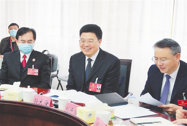 1月24日,参加省六届人大四次会议的代表们分组审议政府工作报告。图为孙大海代表参加定安代表团审议。本报记者 王凯 摄