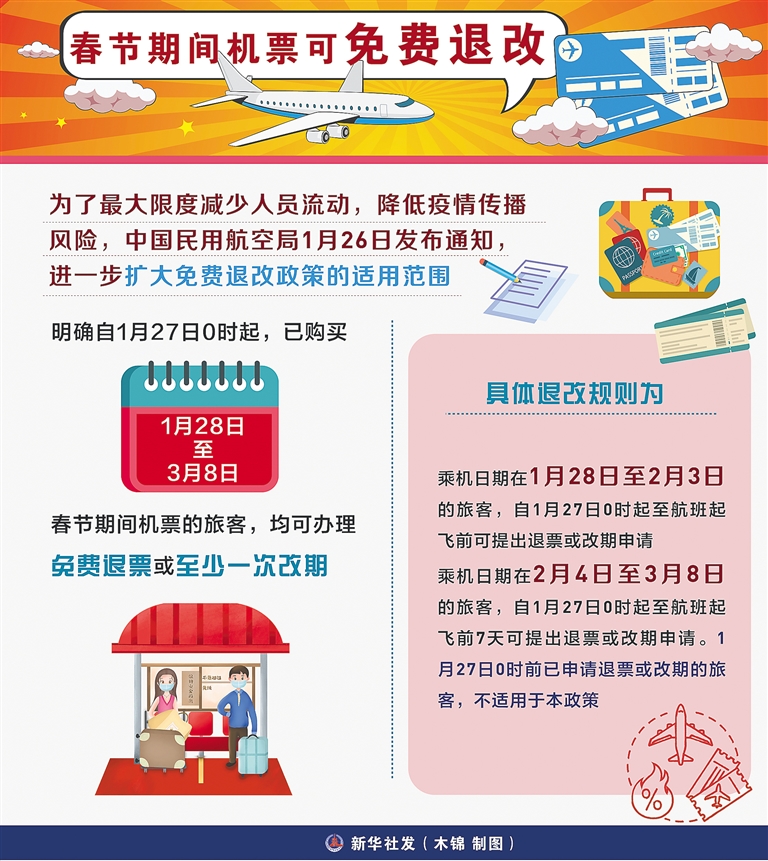 他表示,此前1月2日,民航局已经下发了《关于切实做好疫情常态化防控形势下客票退改服务工作的通知》,针对国内出现局部聚集性疫情的地区,要求各航空公司及时制定发布涉及疫情地区的机票免费退改方案。1月26日的通知进一步扩大了免费退改政策的适用范围,明确了春节期间机票免费退改规定。