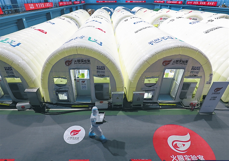 自1月8日在河北体育馆建成投运以来,截至1月22日,石家庄“火眼”实验室(气膜版)共计完成528万人份核酸样本检测。实验室内每三舱“火眼”为一组,分别承担扫码取样、核酸提取和样本检测功能,为石家庄地区的疫情防控工作提供有力支持。