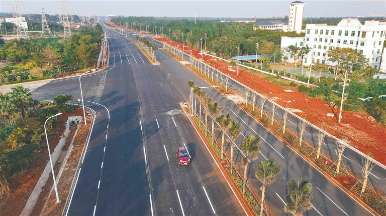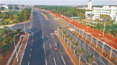 日前,在洋浦经济开发区疏港大道二期工程,道路的园林绿化工程正有序开展,交通标识也正在完善。